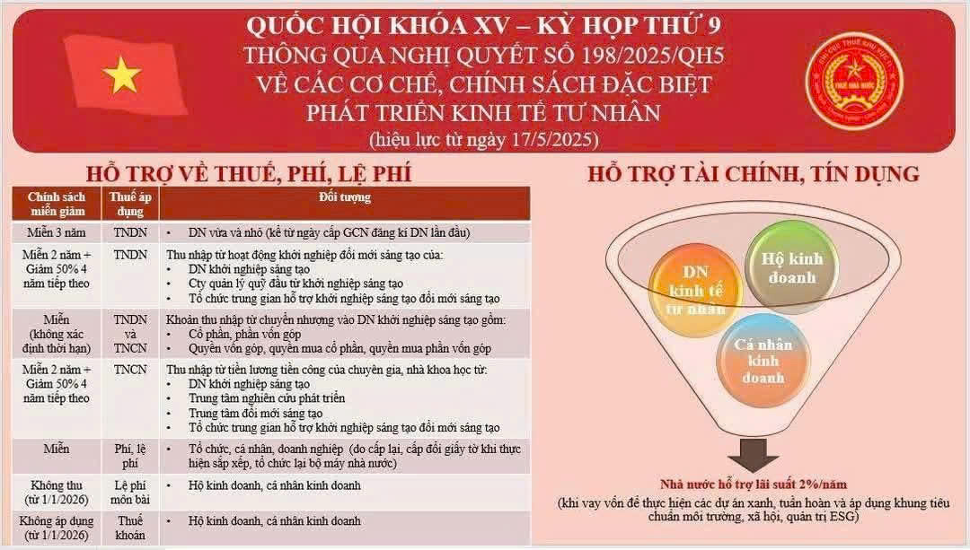 Nghị quyết 198/2025/QH15 được Quốc hội khóa XV thông qua ngày 17/05/2025, nhằm ban hành các cơ chế, chính sách đặc biệt phát triển kinh tế tư nhân. Đây là dấu mốc quan trọng thể hiện quyết tâm của Nhà nước trong việc thúc đẩy khu vực kinh tế tư nhân trở thành động lực quan trọng của nền kinh tế quốc gia.